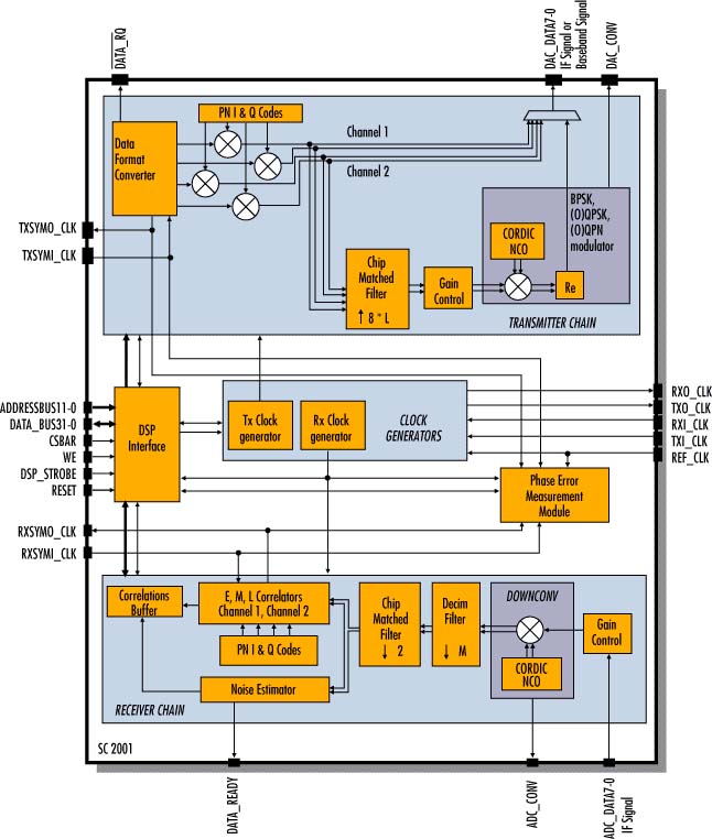 The SC3001 DIRAC is a single-chip direct sequence spread spectrum receiver. Its key features are the integration of an ARM6 core on-chip, a flexible intermediate frequency (IF) downconverter, a Chip Matched Filter and 7 complex parallel correlators, making the chip suited for a wide application area. Because of the integrated 32-bit RISC ARM6 processor core, the SC3001 DIRAC IC implements a complete receiver, and requires no external processor. The DIRAC performs digital downconversion from a programmable Intermediate Frequency up till 10 MHz, Square-Rooted Raised Cosine (SRRC) filtering, fully programmable despreading, frame extraction and user interface tasks which are necessary to convert a sampled IF signal to data. The on-chip RS-232 UART module provides an integrated data and control I/O interface. The ARM6 core offers the benefits of a standard programmable component, such as a short design time and programmability, as well as the availability of development tools, like a C-compiler and a debugger. The customized hardware gives the chip the extra performance, which cannot be reached with standard components, at low cost and low power. The features of the resulting IC are ideal for mobile communication terminals. The ARM6 C-compiler allows to port common functions easily across applications and develop the low rate demodulation and control routines late in the design cycle of the final product. It hence allows to fine-tune the final program after field measurements. The SC3001 DIRAC can operate both in CDMA (Code Division Multiple Access) and non-CDMA mode. In default CDMA mode, transmitter and receiver are able to demodulate 4 channel CDMA/BPSK or 2 CDMA/QPSK channels in parallel. In Synchronous CDMA (S-CDMA) mode or Quasi-Synchronous CDMA (QS-CDMA), the receiver is operating as a dual (Pilot and Traffic) demodulator. This option is e.g. used in high capacity CDMA-based VSAT star networks. The chips of the spreading sequence can be modulated in BPSK, QPSK, OQPSK (Offset QPSK), QPN (Quadri-Phase Pseudo Noise, i.e. using different spreading codes on I- and Q-branch) and OQPN (Offset QPN) and the differential PSK versions of these schemes. The receiver can be configured in all the above mentioned demodulation schemes and modes. Full flexibility is provided by 2 on-chip synthesizers: sampling and carrier frequency synthesizers in the receiver. The programmable sampling synthesizer generates the adjustable oversampling clock up till 20 MHz, while the carrier frequency synthesizer generates carrier waveforms at an intermediate frequency (IF), freely programmable up till 10 MHz. Additionally, the SC3001 DIRAC offers a carrier phase step input, which allows a frequency jitter-free carrier reconstruction loop. The chip matched filter (CMF) in the receiver is a SRRC (Square Rooted Raised Cosine) filter, implemented as a 35-th order FIR filters. The roll-off factor of 0.4 is convenient for a wide range of applications. The spreading and correlating pseudo-noise (PN) sequences are fully programmable. The maximum code length is 1,023, hence providing a Processing Gain of over 30 dB! Immediate swapping between different downloaded PN-codes is possible. FEATURES: