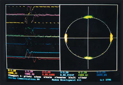 CDMA Modem Development Kit (See also the Windows-based CDMA Development Accelerator). The DOS-based CDMA Development Kit allows to continuously monitor in real-time up to 6 simultaneous receiver signals, such as correlation values, the receiver phase error, the AGC value, the carrier recovery and the timing recovery. A complex constellation diagram can also be shown. These measurements allow to quickly evaluate the performance of a receiver, and to tune the transmitter and/or receiver parameters. The ASTRA Development Board allows to program a huge range of modem parameters, and to derive Bit Error Rate (BER) figures. The effect of typical parameters of the Development Board can immediately be quantified using the ASTRA Development Kit. For instance, the step response of the PLL for carrier recovery can be visualised as a function of the PLL gain and PLL bandwidth. The ASTRA Development Kit consists of the following parts: 1. Development Kit Monitor software